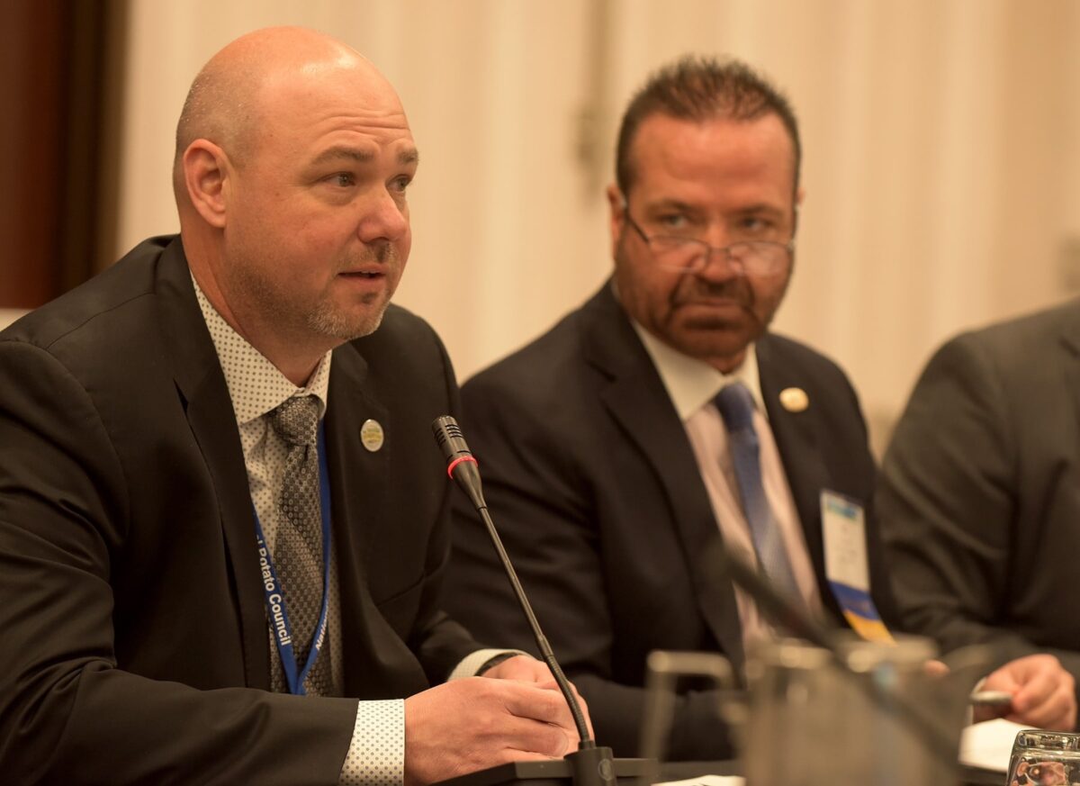 Top photo: Jared Balcom, left, 2022 National Potato Council President, speaks as RJ Andrus, VP of Legislative Affairs listens during the NPC’s 2022 annual meeting in Washington, D.C. Photo: Bill Schaefer Photography