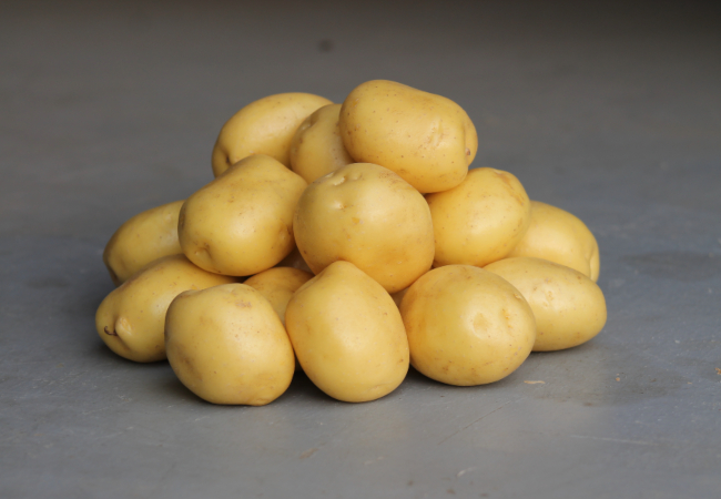 Strengths: Constance is a yellow-skinned, pale yellow-fleshed table potato suitable for general use. With early development after planting, this is a good early main crop variety, with oval round tubers of regular shape and shallow eyes. It produces good-sized tubers that are resistant to secondary growth, black spot and growth cracks. This variety is well suited on most soil types. With a medium dry matter of 20.2%, it eats well and retains its color after peeling. It has a buttery taste and smooth texture, making it ideal for mashing, boiling or baking.