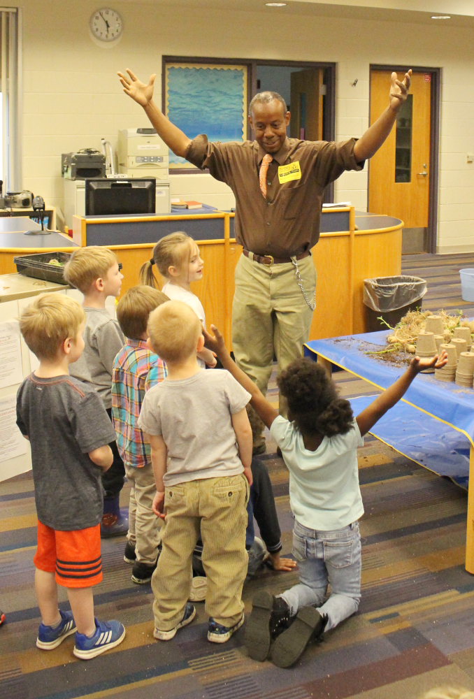 “We’re going to roll up our sleeves because we’re going to have our hands in dirt,” said TC Collins to kids at Model Elementary