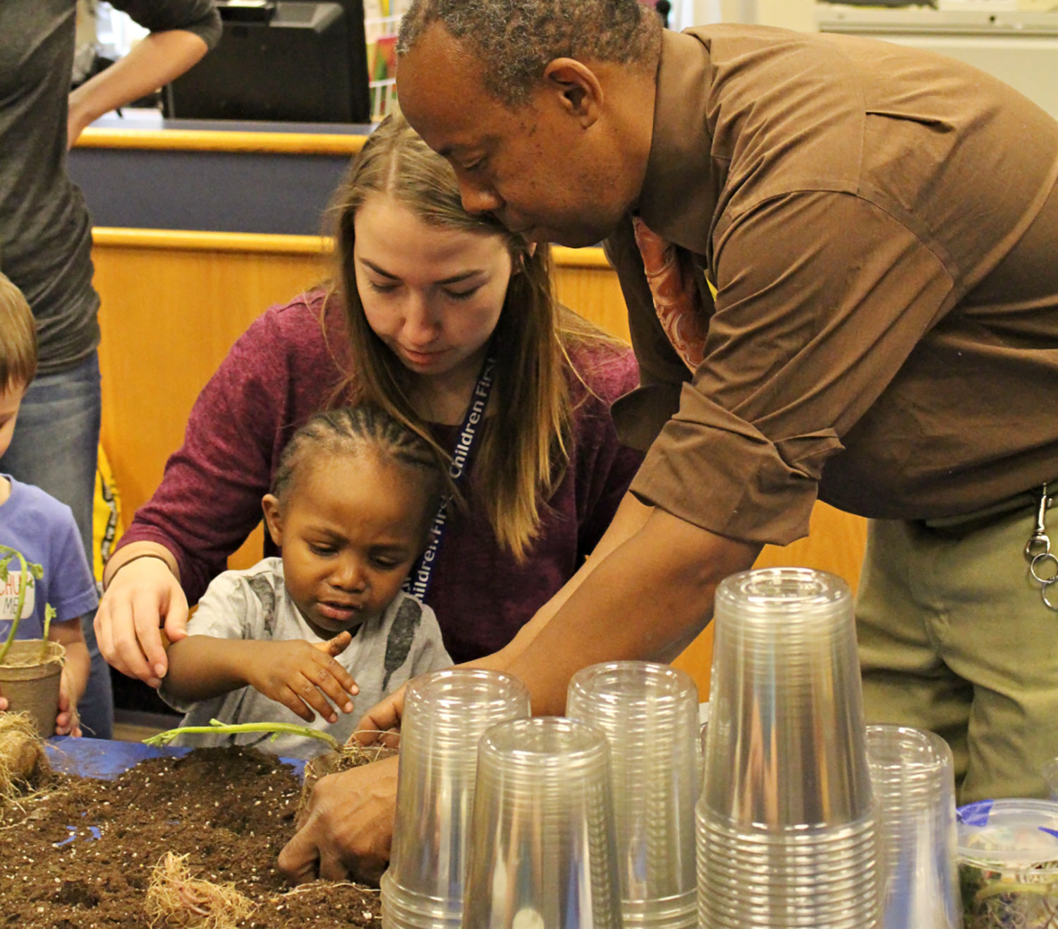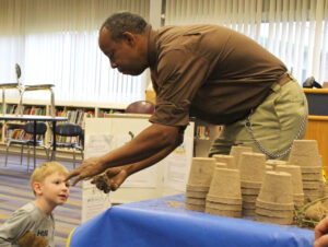 TC Collins helps a child pot a potato plant at one of his in-school instructional events in May 2019.