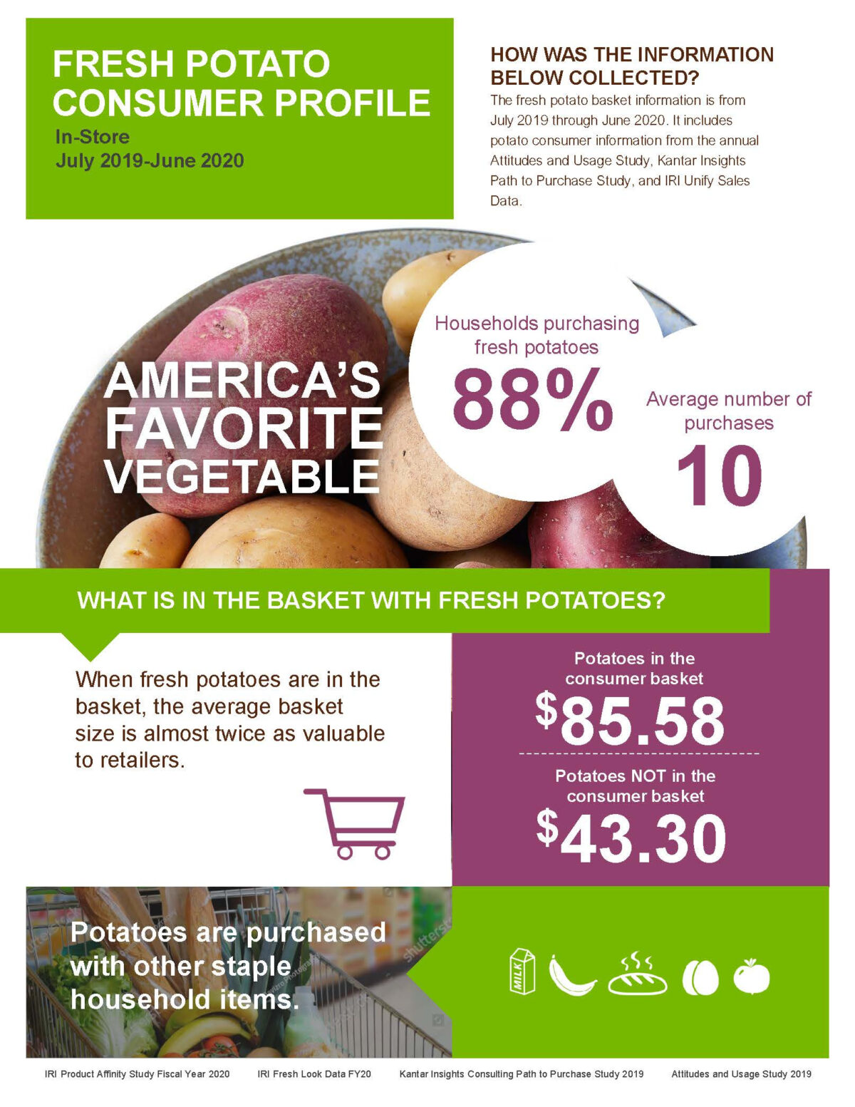 - Potatoes continued to be bought most often with bread, milk, eggs, onions and other staple household items. However, consumers increased their basket sizes all around the store, including baskets with fresh potatoes.