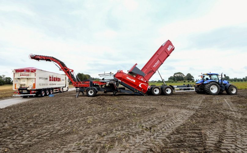 The company said the Field Loader 240 reduces the amount of soil and waste that accompanies product loading because tipping trailers can unload the product directly into the transfer combi for cleaning before it is loaded into a truck. With this machine, Dewulf said, transport vehicles are optimally filled with net product, and the chance of price deductions when delivering potatoes from the field directly to the factory is drastically reduced.