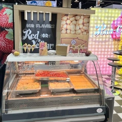 The booth design resembled an ice cream shop focusing on red and yellow potato flavors. At first glance, many attendees thought they were lining up for ice cream samples. However, they were in for much more of a treat. Red River Valley Chef Heather Schneider developed two recipes featuring red and yellow mashed potatoes. The samples were served in paper cones resembling ice cream cones and topped with “sprinkles” (potato toppings).