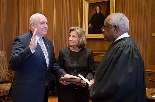 Sonny Perdue was sworn in as the 31st U.S. secretary of agriculture by fellow Georgian and Associate Justice of the U.S. Supreme Court Clarence Thomas in a brief ceremony April 25 at the Supreme Court building. The U.S. Senate confirmed Secretary Perdue by a vote of 87-to-11 on April 24.