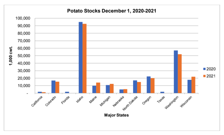 Potato stocks in the major potato-producing states totaled 265 million cwt as of Dec. 1, a 2% decrease from a year ago.
