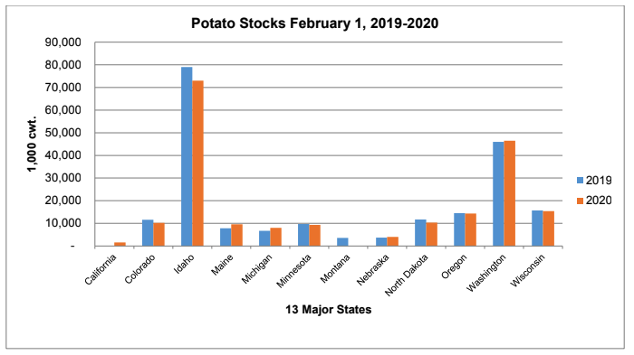 - Nationally, the 13 major potato-producing states held 204 million cwt of potatoes in storage Feb. 1, 2020.