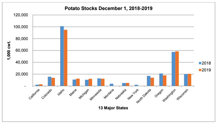 As of Dec. 1, 2019, there were 267 million cwt of potatoes in storage in the 13 major potato-producing states the USDA-NASS tracks.