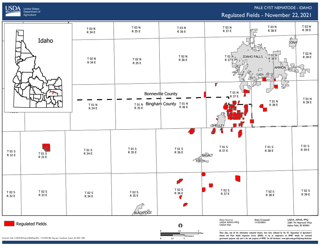 The release of acreage leaves 6,570 acres still regulated, 3,446 of which are classified as “infested” with PCN. The infested fields are located within an 8.5-mile radius in Bingham and Bonneville counties. The remaining acreage are fields classified as “associated” with the infested areas.